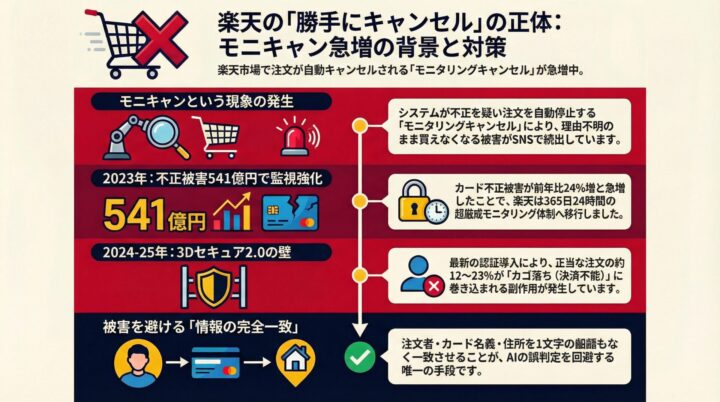 楽天を長く使ってきたがこんなこと初めてだ、当然不正行為などは全くしてない、っていうか以前から同じ楽天アカウントを使っていて同じ楽天クレジットカードを使っている。少し調べてみると現在の楽天は2025年あたりからクレジットカードやデビットカードの不正利用に対処するためにモニタリング(AIによる不正使用判定)の判定を厳しくしてるらしい、それで俺の楽天での買い物、連続10件の注文が不正判定されて全てキャンセルになったらしい。
