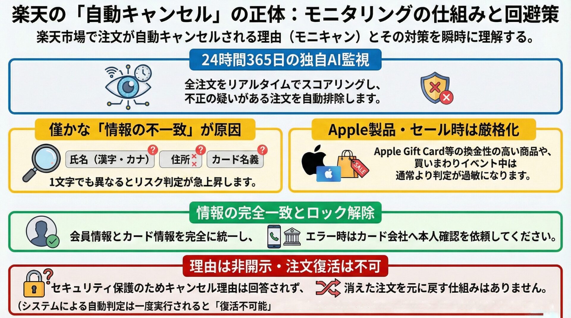 PCやスマホ、WiFiやモバイル通信も何か関係があるかも、ただ俺の場合スマホの楽天モバイル通信時でもキャンセルされたので関連不明。それとApple Gift Cardのように犯罪者に狙われやすい商品を買うとおそらく一時的にモニタリングスコアが跳ね上がる可能性がある、このあたりのギフト券の注文も考えた方がいいかもしれない。